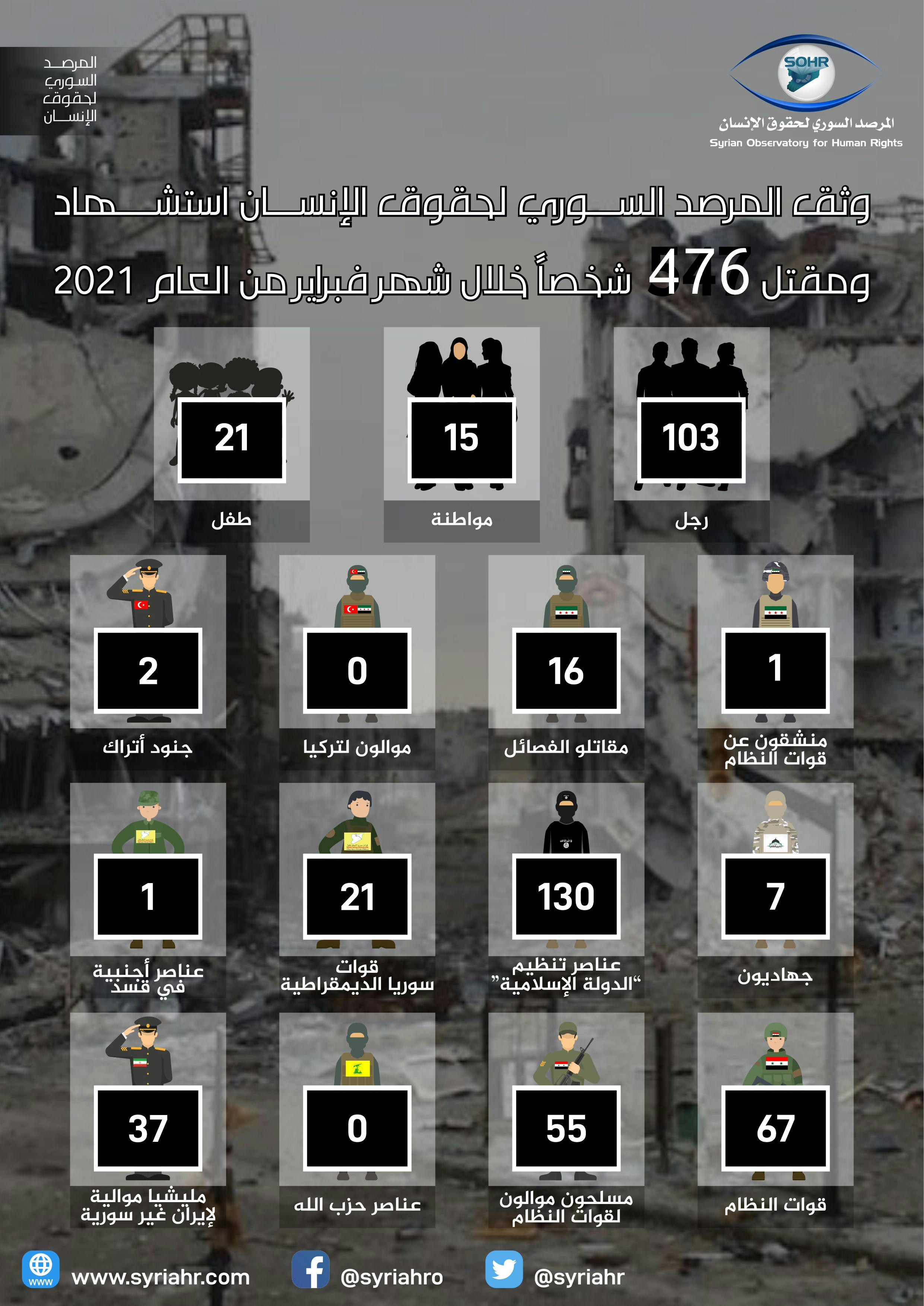 وثق المرصد السوري لحقوق الإنسان، استشهاد ومقتل 476شخصاً خلال شهر شباط / فبراير من العام 2021، توزعوا على الشكل التالي::