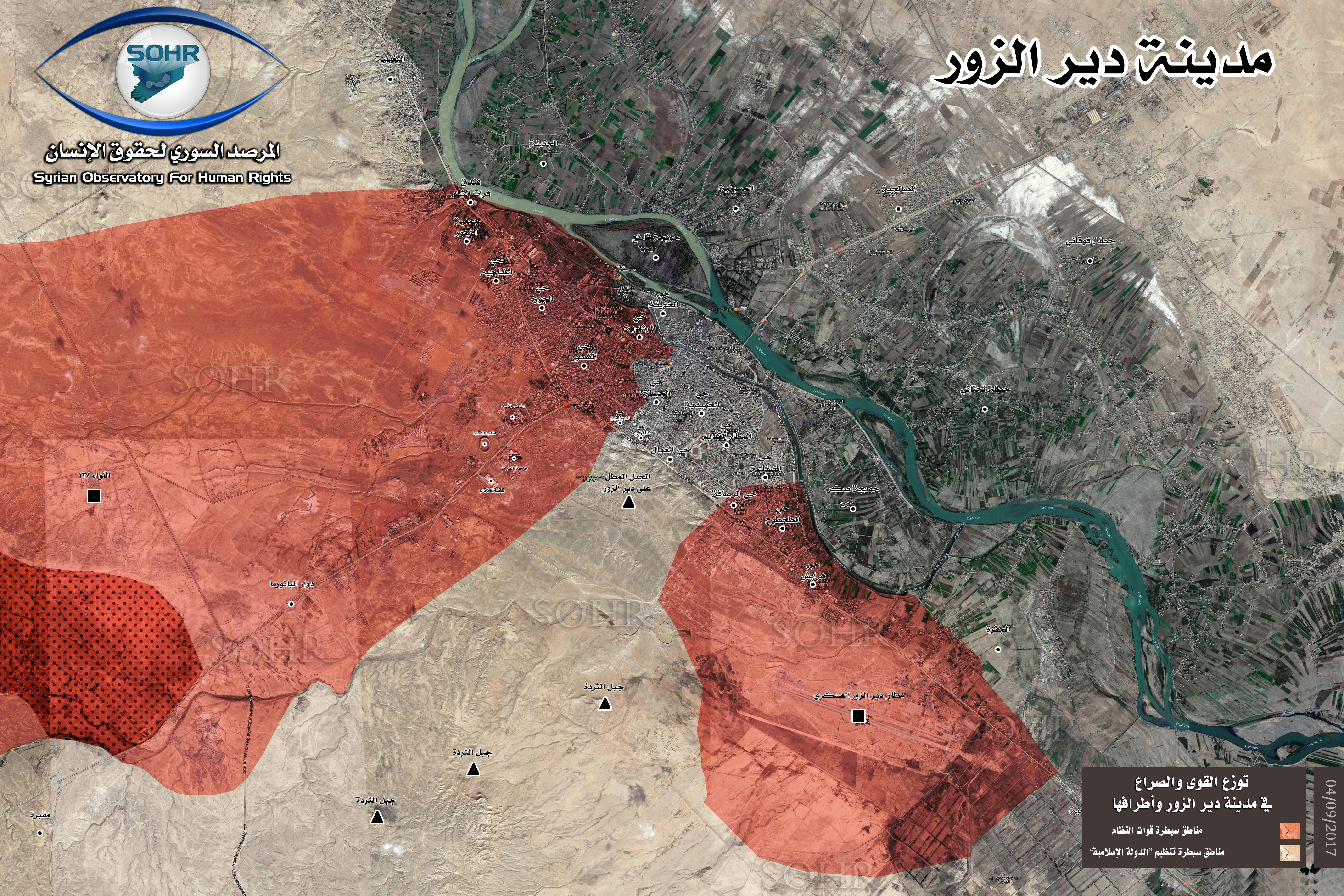 This approaching to the military base of Deir Ezzor, comes in conjunction with violent clashes taking place between the regime forces and their allied militiamen against members of ISIS in the vicinity of Brigade 137 besieged by ISIS, where the clashes are concentrated between the advanced and besieged regime forces against ISIS members, where the regime forces are trying to advance and meet their besieged forces in the Brigade to implement the first step of lifting the siege on the regime forces controlled areas in the city of Deir Ezzor, while reliable sources asserted to the SOHR that ISIS blew up 8 car bombs in an attempt to prevent the advancement of the regime forces and stop them from meeting the regime forces advancing from the western countryside of Deir Ezzor.