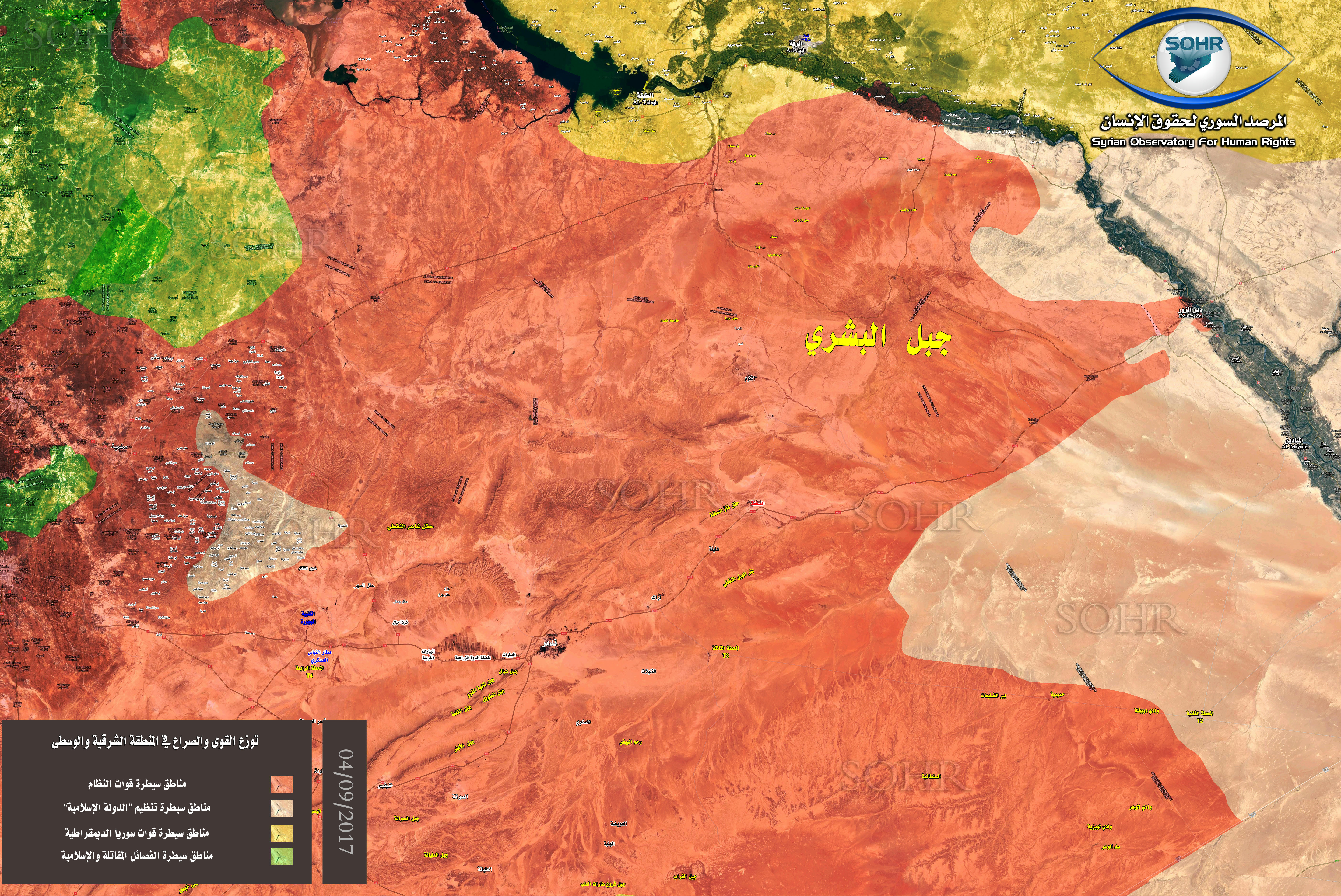 The SOHR published hours ago that The outskirts and the vicinity of Deir Ezzor city is witnessing violent clashes between the regime forces backed by their allied militiamen of Syrian and non-Syrian nationalities against ISIS members. The SOHR monitored the advancement of the regime forces and their control over the towns of Kabajeb and al-Shoula located on the main road of al-Sukhnah and Deir Ezzor city, and they managed to advance and get closer to the military base of Deir Ezzor besieged by ISIS. The regime forces have become less than 12 km away from the walls of the base which has been besieged since January 2017, as a result of violent attack by the organization, in which they managed to impose full siege on the airport and the nearby neighborhoods of Harabesh and al-Tahtouh, and the SOHR learned that Russian warplanes continue carrying out airstrikes targeting the “Islamic State” organization-held area and positions in the vicinity and the outskirts of the city.